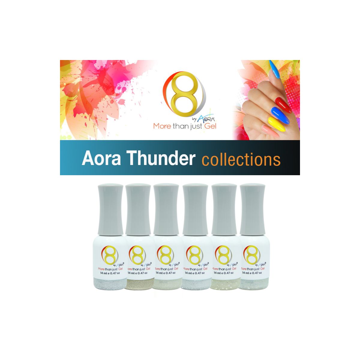 Aora 8 Gel is the new generation in gel technology. Use this easy, workable formula as a superior gel polish or as a gel paint to create wonderfully creative designs. Its advanced formula is safe to use and offers many benefits that allow you to enjoy perfect color and coverage with no worry. Aora 8 Gel has 60 different colors offered in 10 beautiful collections to suit any mood and occasion.