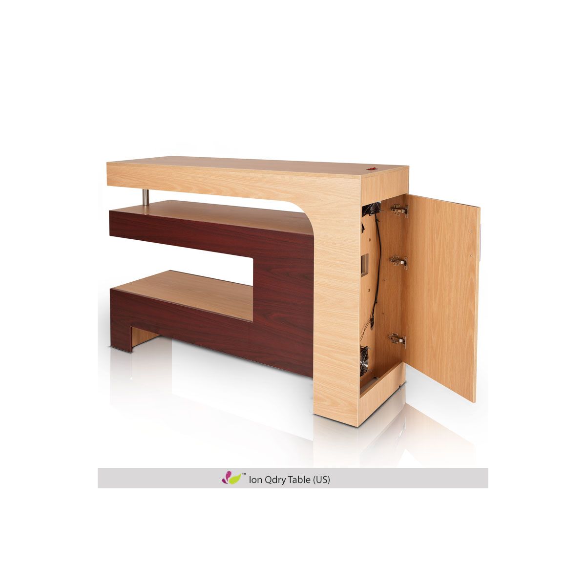 The Ion QDry Nail Table is a stylish, duo-tone nail drying station that seats up to four people. This beautiful drying station features duo-tone laminates, New Natural Oak and Mahogany. This convenient station includes three built-in fans for faster drying times. Each Ion Quick Dry also includes 8 high-quality UV bulbs for hands and for feet.
