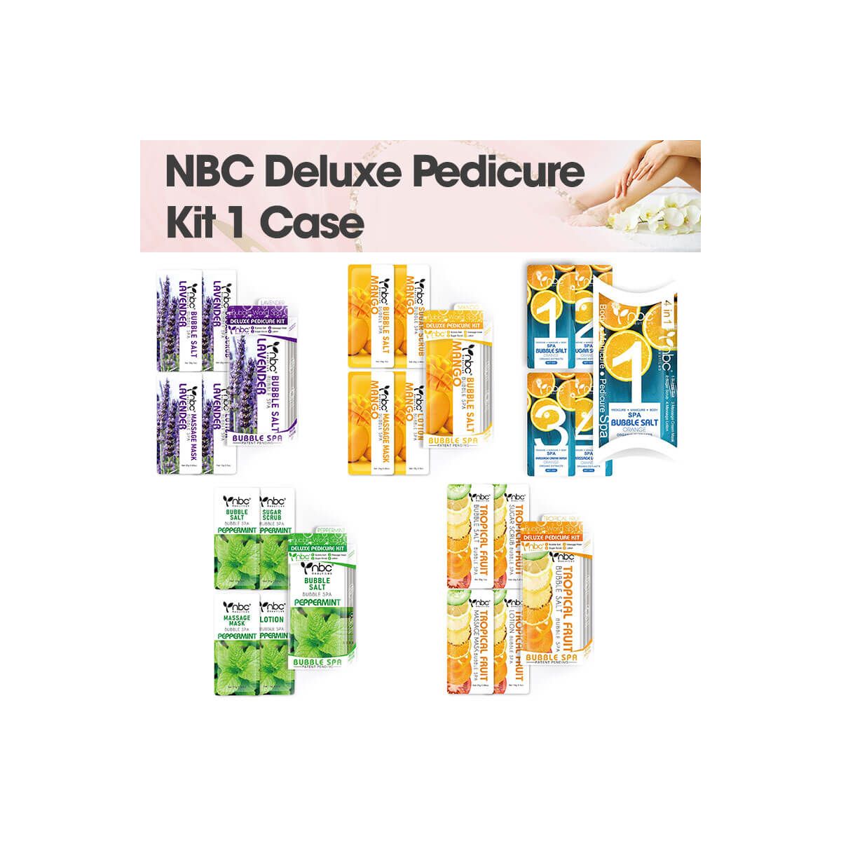 Receive a case of 50 Deluxe Pedicure Kits in your choice of blissful scent to provide relaxing, moisturizing pedicures or manicures, all prepackaged and ready to go with no prep needed. Each kit delivers a complete 4-step single service that soothes, exfoliates, and moisturizes hands, feet, and body with natural ingredients and organic extracts.